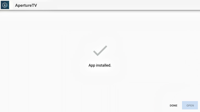 6. The installation is concluded, and the app installation notification appears. You may now click OPEN to start using ApertureTV. Some recommend selecting DONE to delete the APK file and free up space on the FireStick storage.